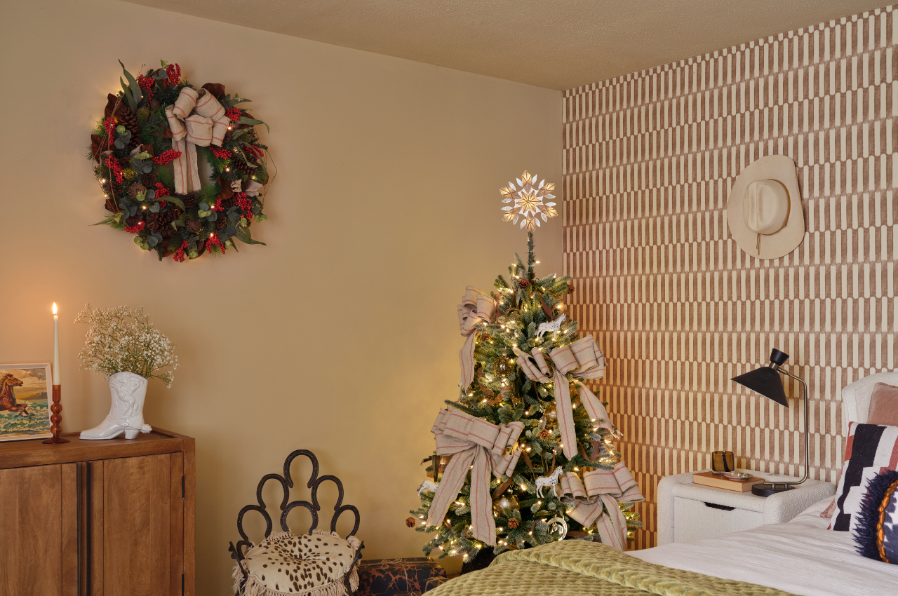 While Beyoncé may have brought cowboy couture to fashion runways this year, this trend brings with it an earthy, homespun twist. “I like to think of the ‘Cowgirl Christmas’ trend as yeehaw-meets-hygge,” says Williams. “This trend is all about texture, with a colour palette that leans into earthy browns, sand-washed neutrals, and caramel creams. Oversized jute rosettes add a rustic, farmhouse feel with pinecones adding further natural touches.”