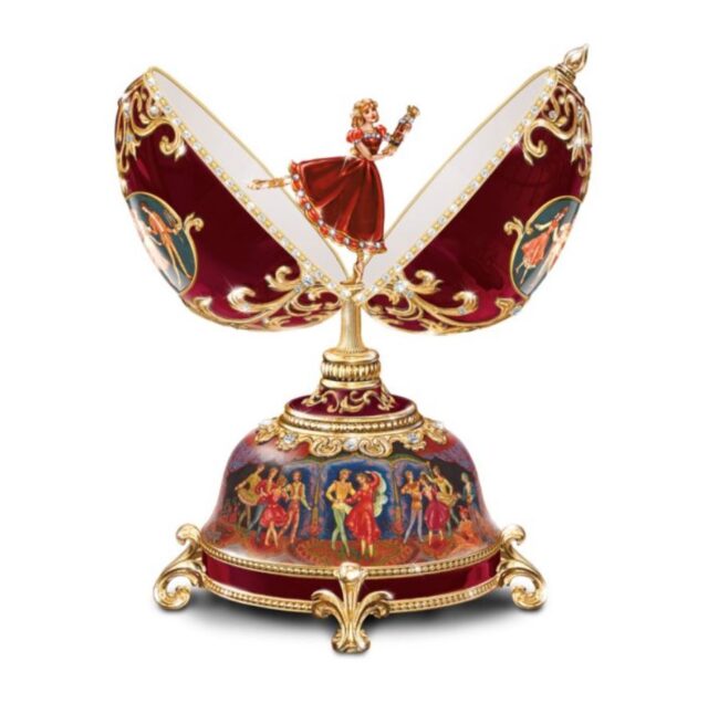 This Fabergé-inspired musical egg, available exclusively from The Bradford Exchange, perfectly showcases the story of the Nutcracker. Decorated with Russian Palekh-style artwork, an enamelled pewter figurine of Clara is captured in motion. The egg, base and figurine all feature 22-carat gold-plated scrollwork and sparkling gems, highlighting meticulous workmanship.